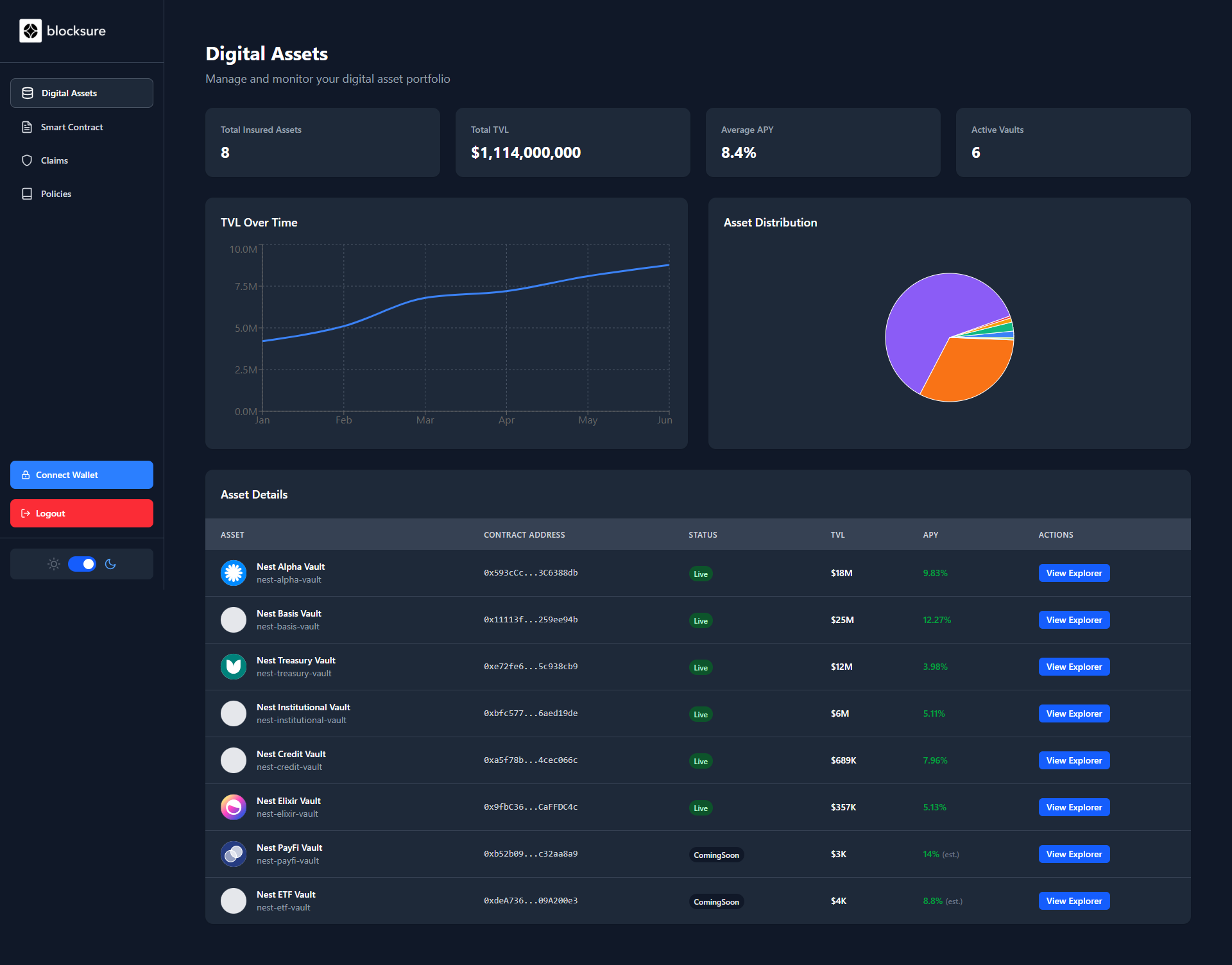 פלטפורמה מתקדמת לביטוח נכסי קריפטו עם שילוב Web3 מלא - מחיבור ארנק, דרך רכישת כיסוי, ועד הגשת תביעות. עיצוב מודרני, חוויית משתמש מושלמת ואבטחה ברמה הגבוהה ביותר.