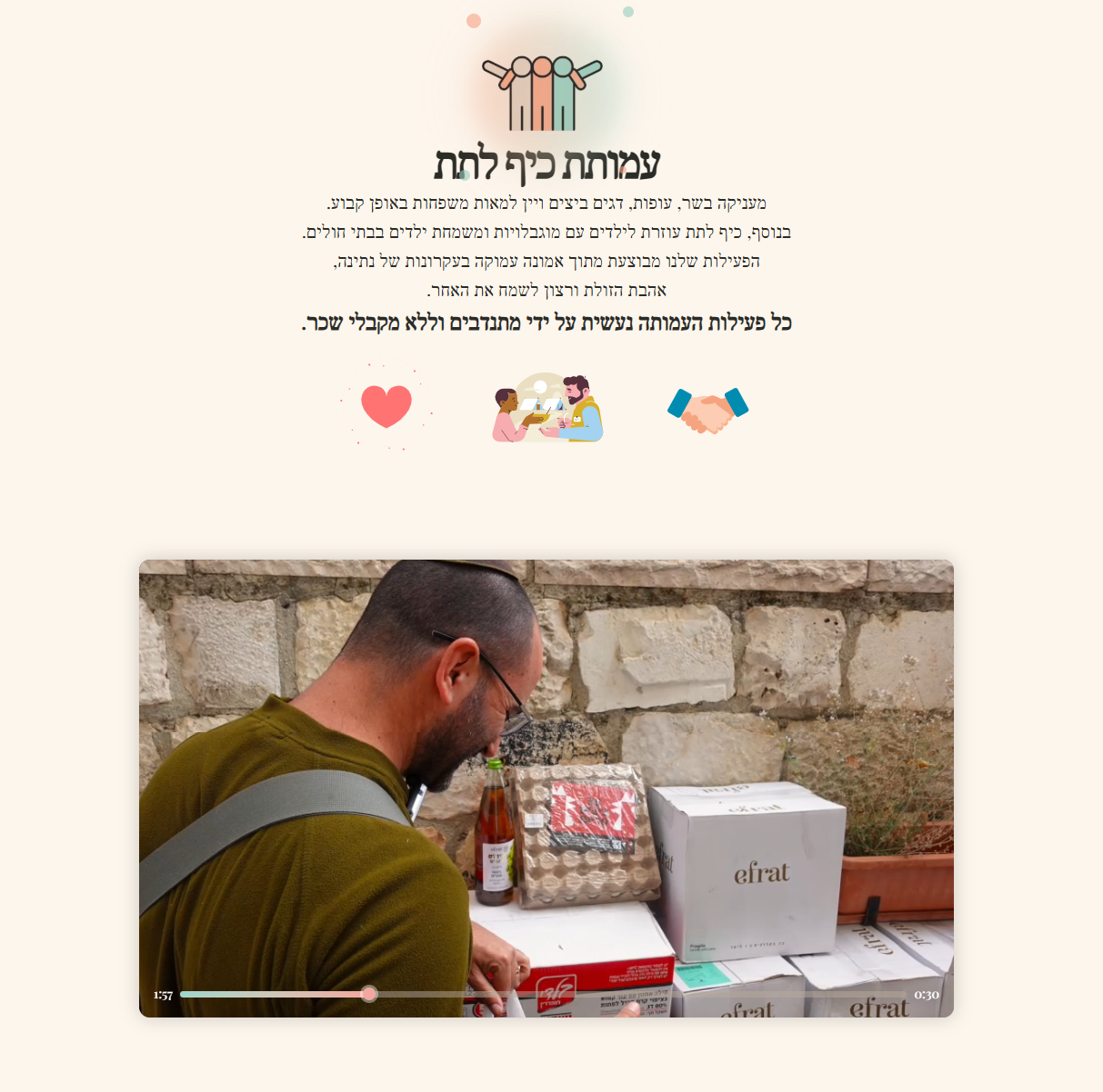 האתר נבנה עם עיצוב רגשי וחם, המשדר את ערכי הנתינה והעזרה הדדית. השימוש בצבעים רכים, בטיפוגרפיה ברורה ובממשק אינטואיטיבי יוצר חוויה נעימה למשתמש ומעודד מעורבות חברתית. הלוגו המרכזי של העמותה מוצג בצורה בולטת ומזמין את המבקרים להיות חלק מהמסע החברתי.