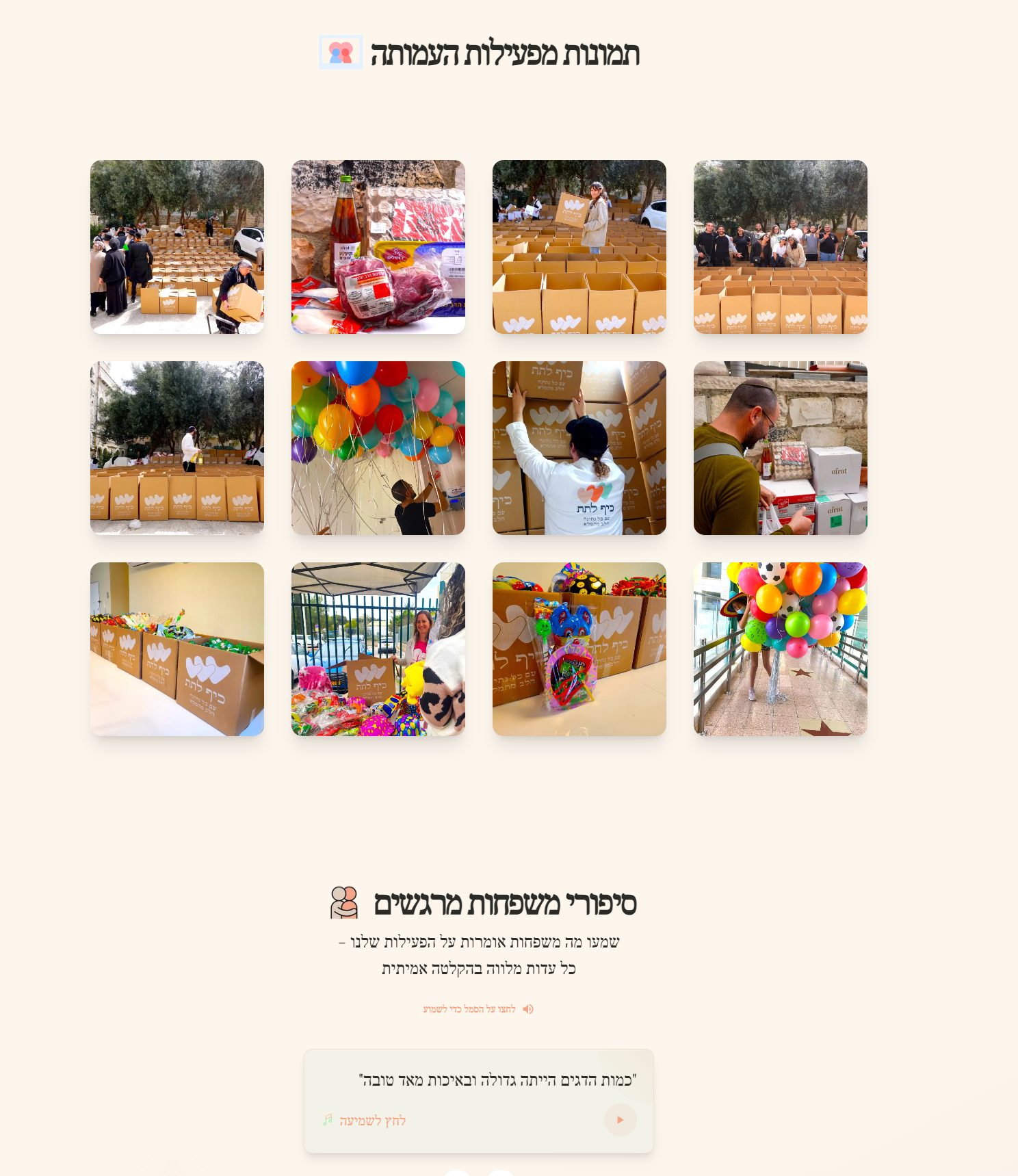 אתר דיגיטלי חברתי לעמותה הפועלת למען משפחות נזקקות בישראל. פלטפורמה מינימליסטית ומרגשת שמציגה את החזון "עם כל נתינה הלב מתמלא" ומאפשרת יצירת קשר ישיר לתרומות ומעורבות חברתית.